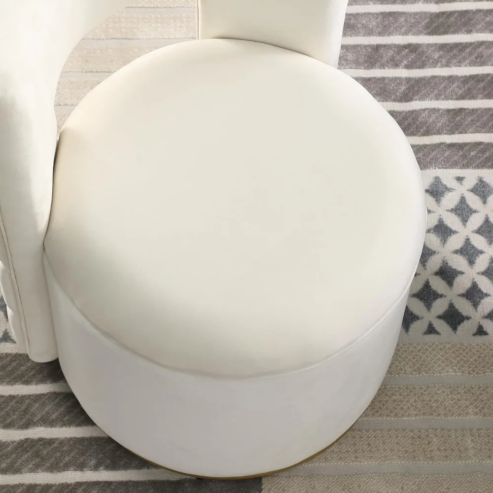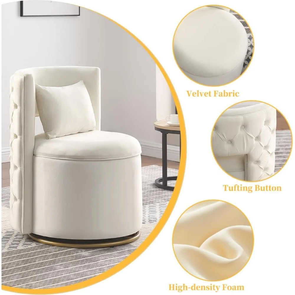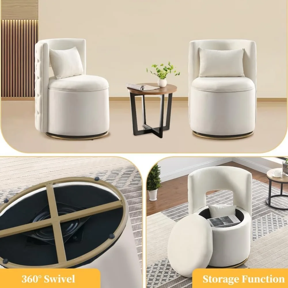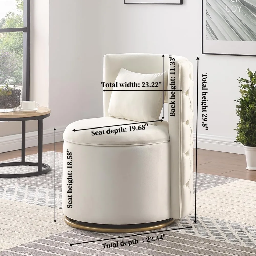This swivel chair offers a 360-degree rotation, featuring an elegant design that makes it a standout piece in any room, be it your living room, bedroom, office, or nursery. Crafted with a metal base and solid wood frame, it boasts a plush foam seat for ultimate comfort, capable of supporting up to 220lbs. The chair also includes a hidden storage compartment under the removable seat cushion, perfect for keeping pillows, throws, and books, ensuring your space remains neat and organized. Upholstered in velvet fabric, it provides a soft, skin-friendly touch, with a high-density foam seat cushion for durability and resilience, and additional pillows for enhanced back support. The ergonomic curved backrest adds to the comfort, making it an ideal choice for relaxation in various settings. Assembly is a breeze, with clear instructions included for a quick setup in just 15 minutes. The chair’s overall dimensions are 22.4 inches by 23.23 inches by 29.53 inches.